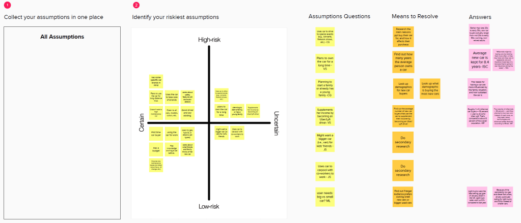 I used this method to generate a broad array of ideas quickly. I spent a total of 20 minutes for this activity – 10 mins. during the first round to generate as many ideas as possible in rapid succession, and then another 10 mins. to explore a single idea further (i.e., car-buying checklist). The following ideas were generated at the conclusion of this activity: