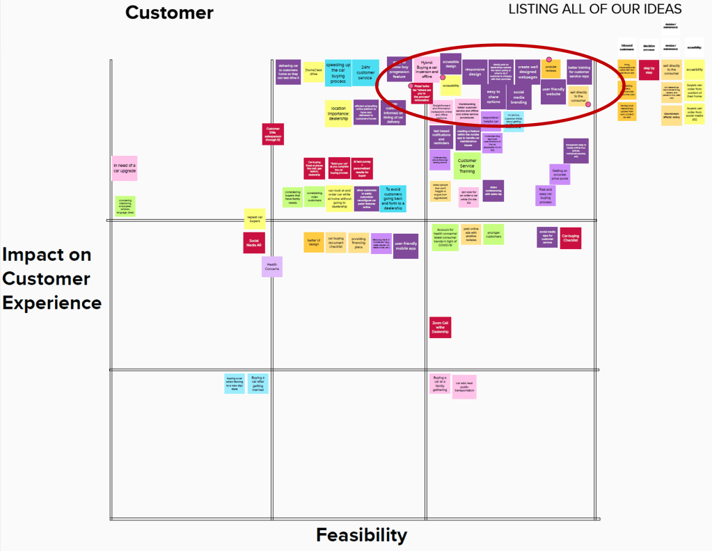 I used an idea portfolio chart to sort and rank my ideas based on overall feasibility and impact on the customer’s experience. The following ideas from the top right quadrant were selected: