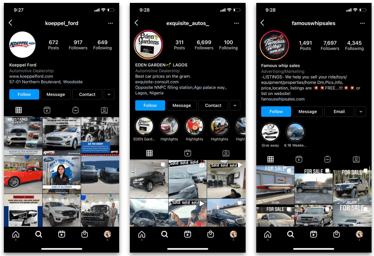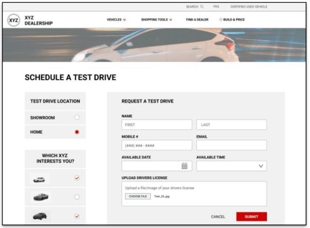 - Using customer’s social media direct messaging feature to connect with a local dealership to purchase a car