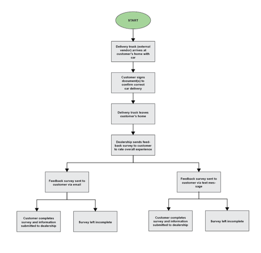 - Customer receives communication (e.g., text, email, or DM) from dealership at different touchpoints during the car-buying journey (e.g., after talking to a salesperson, after purchasing a new car, after completing a test drive at home, etc.) and asked to provide feedback